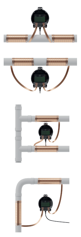 In case of limited space, the windings can be placed partly on the main pipe and partly on the distributor pipe. All these different installations are possible because the treatment impulses extend over several meters to either side of the pipes. Please observe different placement examples, shown in the images below.